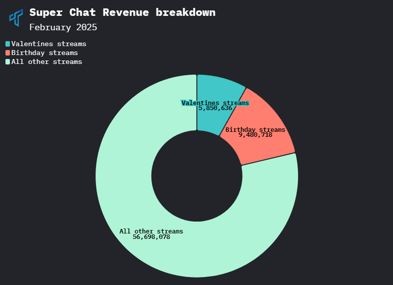 Valentines streams saw a total revenue of 5,850,636 JPY (approx. $39,245) which comes out at 8% of Hololive’s total super chat revenue for the month. Birthday streams accounted for 13% of super chat revenue.