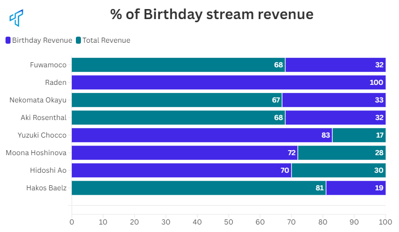 On average, for those who had a birthday this month, 49% of a talent’s total monthly Super Chat revenue came from their birthday stream. (Note: Raden was excluded from this analysis.)