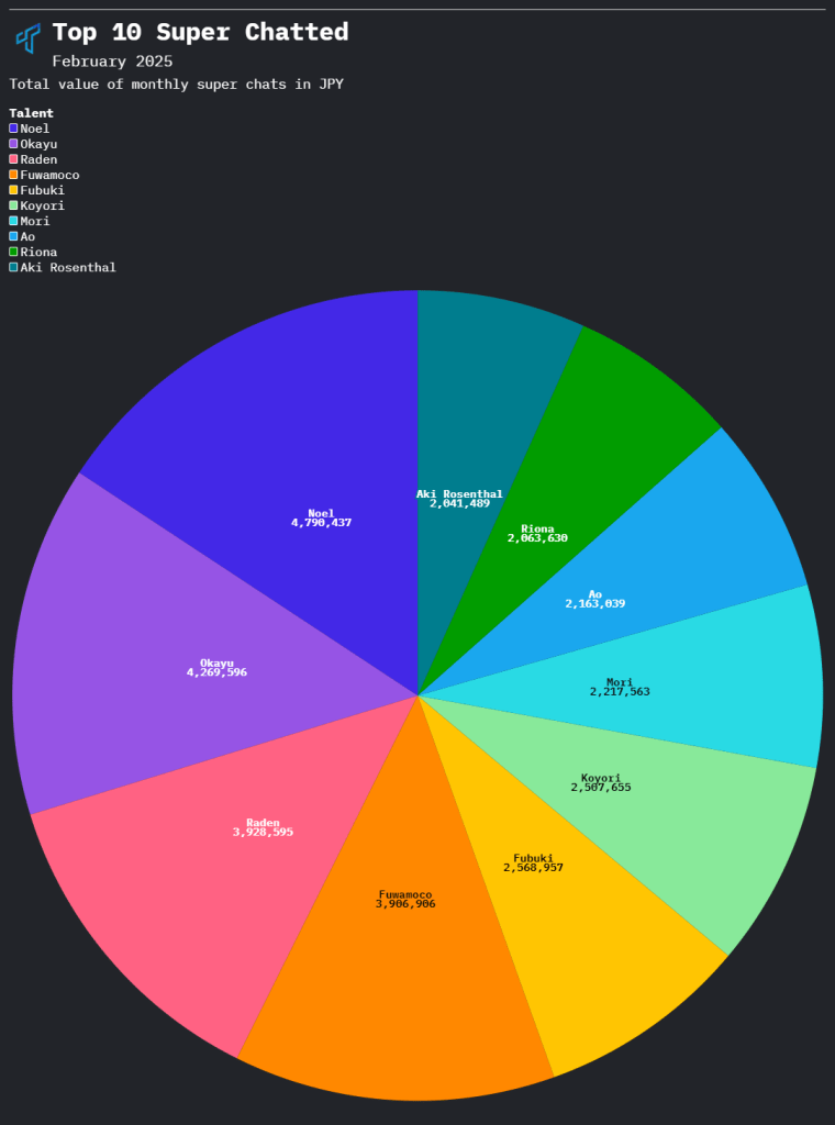 Shirogane Noel sits a top as the highest earner from Super Chats in February with just under 4,800,000 JPY (approx. $31,735)beating out Okayu who sits in 2nd. Of the top 10 Super Chat earners 5 of them belong to Hololive Japan where as a further 3 belong to DEV_is which is also a Japan based branch. Meaning Mori Calliope and Fuwamoco are the only non JP talents to make the top 10. It is worth noting these 2 aforementioned talents do reside in Japan and engage with Japanese audiences, emphasising the Japan centric dominance of Hololive.